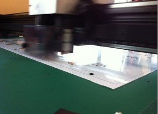 印刷後、UVラミネートフィルムを施し、専用の裁断機械にて裁断します。